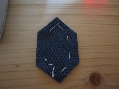 Schablonen ausgedruckt. 1. Frage, nehmt ihr normales Druckerpapier oder einen festeren Karton? Dann hab' ich die Schablone auf die linke Stoffseite gelegt und außenherum mit 1/2" Rand zugeschnitten. Steht so in meinem schlauen Buch. Anschließend den Rand umgeschlagen und mit Reihfaden fixiert.