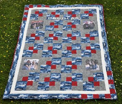und geht nun auf Reisen! Der Quilt ist 60" x 82" - die Blockvorlage ist aus dem Net. Ich hab Dallas-Cowboy-Stoffe genommen (GROSSES Dankeschön an Quilt-infiziert/Marianne), den Rest hatte ich auf Lager. 4 Bilder hab ich noch mit reingenäht "Daddy & Sohn".