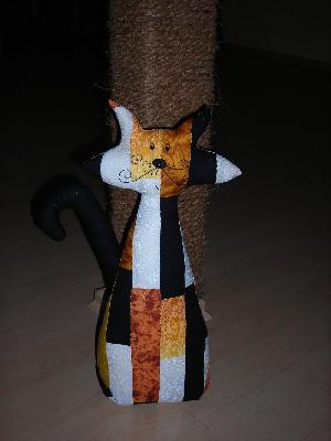 Hab die Katze fertig genäht mit in den Urlaub genommen und dort das Gesicht gestickt und die Mieze gefüllt. Im Po ist ein bißchen Dinkel für besseren Stand.