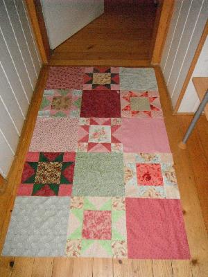Hier seht Ihr das Innenteil, da fehlen noch die Eckquadrate an den Sternen, aber die Stoffe sind schon mal dazugelegt.