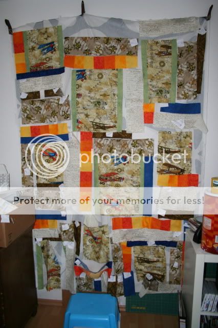 Der stand da und dort, wo das Top nun hängt, ist sozusagen meine "Designwand". Da hingen alle einzelnen Stoffstücke. Und immer wenn ich was zusammennähte waren ja 1,2 oder 3 Nadeln über. Die hab ich erst brav rüber an den Tisch gebracht. Irgendwann wurde es mir zu doof. Nunja und es erwies sich als verdammt gut, die Nadeln da reinzustecken. So hattest du sie immer zur Hand und am Tisch waren ja auch noch genug