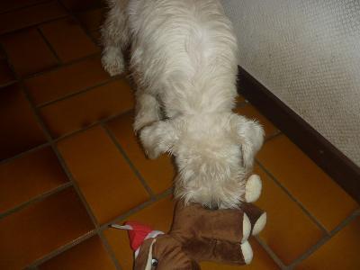 Nach dem ersten Spielen hat unsere Tochter die Nikolausi- Mütze abgetrennt, die hing schon auf halb acht und hätte nicht lange überlebt.