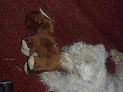 Darin war ein süßer Quitsche- Stoffhund, der nun sein neuer Kumpel ist.