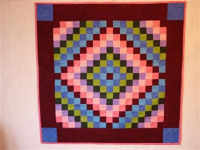 Ich habe die hellgrünen Quadrate u. die dunkelrosa Quadrate diagonal mit der Maschine gequiltet.