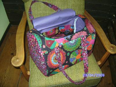 So, nun ist sie - fast - fertig, meine Reisetasche für Fulda. Es gehören nur noch die Innennähte mit einem Schrägband versäubert. Sie hat 2 Innentaschen. Eine davon mit Reissverschluss.