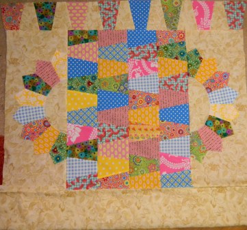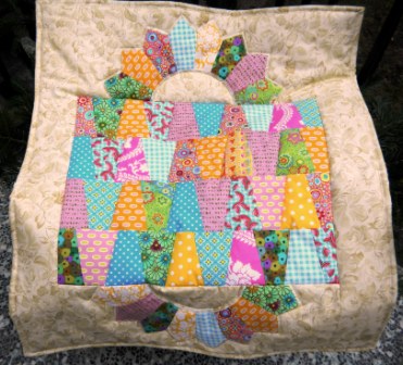 Nach einem "Tauchgang" in Sybilles Restekarton habe ich schon zugeschnittene Tumbler und Teile für Dresdner Teller aus denselben bunten Stoffen zutage gefördert. Daraus habe ich gestern und heute eine Kinderdecke begonnen.