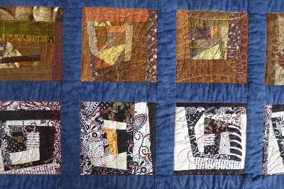 Ich habe in den vier roten Blöcken die vier Elemente gequiltet. Und in den bunten Blöcken sind u.a. alle Sternzeichen. Bei den mittleren Blöcken in schwarz/weiß, braun und gelb/grün ist immer ein anderes Quiltmuster.