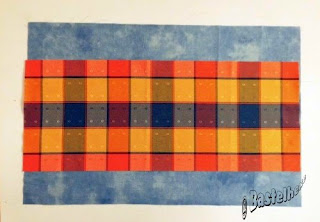 In meinem Fall habe ich für den karierten Stoff das Maß 67 x 27 cm genommen und für den Rückseitenstoff (hier blau) 67 x 44 cm. Die gößere Breite ergibt einen blauen Rand von je 3,5 cm