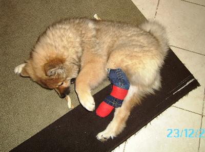 Ich lauf ihm zwar ständig nach, trotzdem war nach ca. 5 Tagen der halbe Gips (Kunstharz irgendwas) weg. Der Tierarzt hat gemeint, der geht noch und hat das Ganze neu mit Vlies ausgestopft (das Lobo sehr gewissenhaft entfernt hatte...) und mit einer roten Elastikbinde umwickelt.