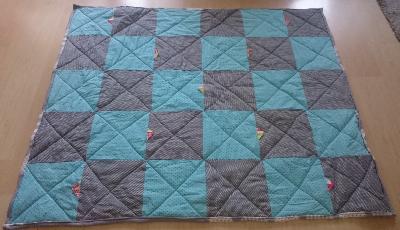 Quilting kann man das auch nicht nennen, ich habe sie nur diagonal mit der Maschine abgesteppt. Als Binding habe ich die Vliesdecke, die ich als Rückseite verwendet habe, einfach nach vorne geschlagen.