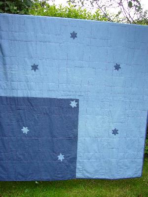 Ich habe gesucht nach eine Idee für meinen Sohn für ein Quilt. Im einem Stoff Geschäft ist mir der Stoff aufgefallen was wird daraus und wie ich das nähe wahr mir sofort klar. Lange Zeit hab ich nachgedacht was nimm ich für ein Stoff für den Hintergrund. Eine PW Näherin hat mir vorgeschlagen Jeansstoff, die Idee fand ich sehr gut.