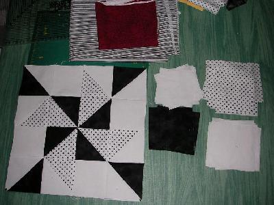 Tanzmaus: Ja, der rote Stoff schleicht sich dann gelegentlich mal rein (siehe den Pinwheel-Quilt von Elissa). Der Stoff darunter sind eigentlich gleichmäßige Streifen Schwarz-grau-weiß für den Rand.