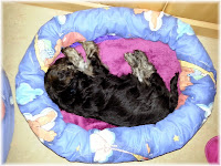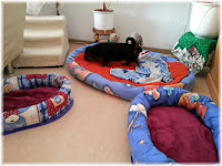 Im neuen zu hause angekommen haben die mich in einem langen Flur ausgesetzt und sind dann einfach weg gelaufen. Könnt ihr euch vorstellen, da stellt sich doch eine vor mich hin und ruft immer so ein komisches Zeug glaube Snoopy oder so. Mir war das egal soll sie rufen ich schau mich erst einmal hier um. Ah da ist das schöne große Bett, dort habe ich schon drin geschlafen und was sehe ich da, noch zwei so kuschlige Betten. Da muss ich doch gleich mal meinen Duft rein bringen. All das war viel zu aufregend für mich drum musste ich mich erst einmal zum schlafen hin legen. Gääääääääään reg und streck, ausgeschlafen. Hm immer noch hier ist doch kein Traum. Diese Zweibeiner laufen wie aufgeschreckte Hühner hier hin und her. Und immer dieses Getue "och ist das niedlich oh wie süß" was wollen die von mir. So langsam bekomme ich hunger, aber in den langen Flur möchte ich nicht nö ganz bestimmt nicht. Als könnte ich nicht alleine laufen wurde ich in einen neuen Raum getragen und vor zwei Näpfen abgesetzt. Was wollen die von mir, ganz schnell war ich wieder in meinem großen Bett. Dann brachte eine die Näpfe hier rein und versuchte mich mit ein paar kleinen Stücken Futter zu bestechen. Ganz vorsichtig holte ich mir eins und brachte es in Sicherheit, immer hin könnte es mir wieder weg genommen werden. Hmmmmmmm lecker. Als sie nicht aufpassten schlich ich mich vorsichtig an die eine Schüssel und holte mir Stück für Stück. Nach der Stärkung musste ich das hier alles noch etwas untersuchen nur viel Zeit hatte ich nicht. Die zwei großen Tiere zogen sich ein Pelz an und namen mich auf den Arm. Das war gut, die glauben doch nicht im ernst das ich die vielen Stufen alleine runder laufe. Unten angekommen bekam ich wieder die Leine angelegt und ich durfte das Areal erkunden. Meine Duftnote und mein Häufchen habe ich auch da draußen hinterlassen damit jeder weis, ich bin hier und das ist mein Revier. Also diese Zweibeiner sind schon ein komisches Volk. Ich musste Kilometer weit laufen um den ganzen Häuserblock. Was denken die sich dabei. Da ist mir wieder meine Bremse eingefallen und ihr könnt mir glauben das funktioniert, ganz schnell war ich wieder auf dem Arm. Nach diesem Marathon war eine runde Kuschel angesagt. Die beiden Tiere waren glaube ich müde und legt sich hin. Aber viel zu weit oben. Wie soll ich da hoch kommen. Mit etwas betteln funktioniert das, schnell war ich oben und konnte schön kuscheln und schlafen.