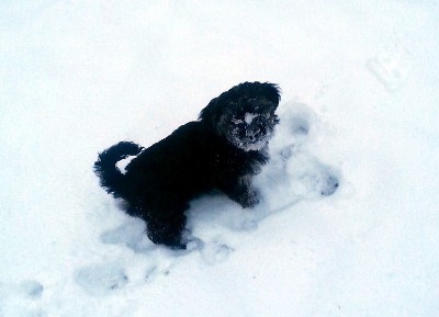 Jetzt kommt es noch dicker. Eines Morgens, lag da draußen so komisches weises Zeugs. Die Mamas sagen Schnee dazu. Das ist zwar auch nass und kalt, aber es macht riesen Spaß durch den Schnee zu tollen. Die Mamas lachen immer und sagen ich sehe aus wie ein Schneemann was auch immer das ist. In den Schnee bohre ich meine Nase ganz tief rein, das dient zur Tarnung damit mich keiner sehen kann.