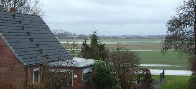 bei uns ist immer noch Landunter Ich mußte mein Nähzimmer ausräumen, weil der Teppich naß war. Alle Regale, Kisten, Körbe usw. So eine Sch..... Hatte so die Schnauze voll, daß ich meinen Mann dann in den Baumarkt geschleppt hab und Bretter und Schienen für ein Wandregal ausgesucht hab. Das haben wir gestern abend noch an die Wand gehängt und jetzt ist endlich Ruh. Beim nächsten Wassereinbruch kann zumindest meinen Stoffen nichts mehr anhaben ausserdem kann ich den Teppich dann ganz schnell hochrollen, so wird der nicht mehr nass. Ansonsten sieht es bei uns zur Zeit aus wie an der Schleswigholsteinischen Seenplatte. Die ganzen Wiesen stehen unter Wasser. Ich warte nur noch auf die Möwen, dann gibts Nordseefeeling Hier mal ein Bild von den Wiesen. Normalerweise ist das alles grün, ohne Wasser