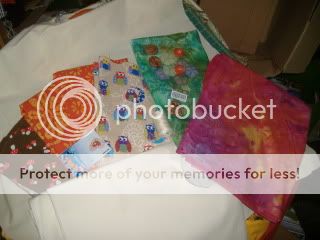 Das ist einmal der tolle EulenStoff und einen passenden beigen Unistoff dazu ... ein brauner Stoff mit Fliegenpilzen ... zwei Batik-Stoffe in Orange-Sonnengelb mit unterschiedlichem Blüten,uster ... ein rot-oranger Batikstoff und ien Grün-gelber Batikstoff ... und ich bin KÖNIG