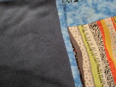 Die Decke ist recht einfach gehalten, die Stoffe habe ich bewusst großflächig gehalten, da Johannes ein gradliniger Elfjähriger ist. In dem Mittelbereich - also die Star Wars Stoffe sind mit Sternen handgequiltet, der Musikstoff ist mit Notenschlüsseln gequiltet. Die Rückseite ist jeansblauer Fleecestoff. leider kommen die Farben nicht wirklich gut rüber