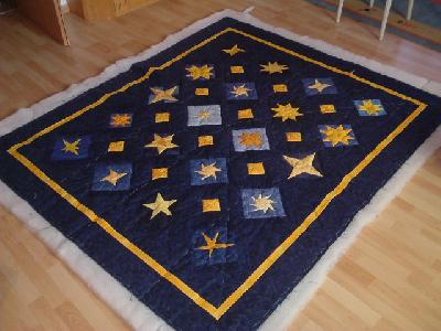 Mittlerweile ist sie fertig gequiltet. Sie ist entstanden aus einem Swap, zu dem ich dann noch Faltsterne genäht habe. Soll die erste große Decke für meinen Sohn werden.