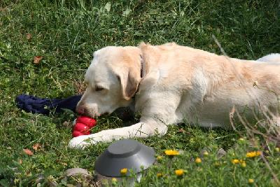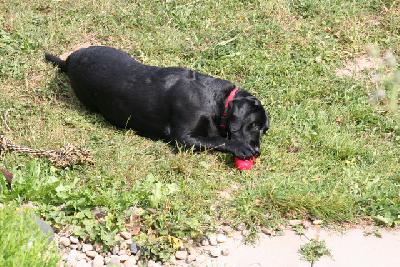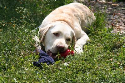 Gestern hat es hier "Hundeeis" gegeben - Joghurteis mit Leberwurstgeschmack. Das wird im sogenannten Kong eingefroren und muß dann rausgeleckt werden. Marnie hat den Bogen gut raus und hat ihren Kong fein säuberlich ausgeleckt. Für Neo war es das erste mal und in seiner Ungeduld hat er versucht, den Kong zu zerkauen, damit er schneller an sein Eis rankommt. Zum Glück ist das gute Stück aus sehr dickem Vollgummi, da ist nix mit zerkauen. So war es für ihn gleich eine Geduldsübung, an sein Eis zu kommen. Heute waren wir unterwegs, da gab's kein Eis, aber morgen soll's ja wieder so heiß sein