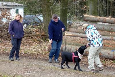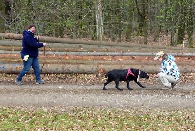 Also, Neo hat das super gemacht, hatten wir auch nicht anders erwartet, er hatte das auf seiner ersten Pflegestelle schon mal gemacht und läuft auch so gut auf Spur, wenn wir was versteckt oder "verloren" haben. Marnie, unser Sensibelchen, ist da schon eine andere Hausnummer. Sie geht ja auch nicht unbedingt zu jedem fremden Menschen hin und an der 5m-Schleppleine laufen und dann noch vor Frauchen - mmmmmhhhhh. Marnie hat also jede Menge Hilfestellung gekriegt indem wir zunächst eine gute Freundin für sie "versteckt" haben (mitten auf dem Weg ), die sich auch noch mit den Leckerlies winkend von Marnie "verabschiedet" hat und der Trail war nur ganz kurz (vielleicht 5 m). Aber Marnie ist auf der Spur (!) für ihre Verhältnisse abgegangen wie eine Rakete und hat sich ein Loch in den Allerwertesten gefreut, als sie Karo gefunden hatte. Marnie hatte wirklich die Nase am Boden, obwohl Karo ja in Sichtweite stand - irre. Wir konnten das dann ausbauen bis ca. 20 m und mit "fremden" Personen (wie fremd ist man sich nach 2 Tagen Seminar?) und wirklich hinter einem Baum/Auto/Holzstapel verstecken. Für Marnie ist das eine wahnsinnige Leistung und ich bin irre stolz auf sie. Sie hat dann gleich noch was gelernt, was sie eigentlich nie lernen sollte - betteln. Und dafür ist sie dann auch noch von jedem belohnt worden .... Naja, dafür hat Marnie ihre Scheu überwunden, ist zu jedem hingegangen und hat auch jede Person gesucht, die wir für sie versteckt hatten. Das Betteln müssen wir dann jetzt über die Zeit wieder abbauen - kriegen wir schon hin