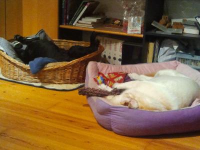 Heute morgen nun beim Frühstück lag Neo wie üblich auf dem Rücken neben Gögas Stuhl. Er wartet immer noch auf die gebratenen Tauben, die ihm in die Schnüss fliegen sollen. Marnie kam immer näher ran und irgendwann lagen die beiden dann Pfote an Po in "Lauerstellung". Da von uns aber nichts kam, wurde Marnies Kopf doch schwer und immer schwerer und irgendwann landete ihr Kopf auf Neos Bauch ... Wenn wir nciht versucht hätten, das ganze im Bild festzuhalten, hätte sie es wahrscheinlich viel länger ausgehalten, aber so haben wir gestört, obwohl wir nur die Handykamera genommen haben. Sie hat also den Kopf wieder hoch, aber die Pfoten liegen noch an/auf Neo: