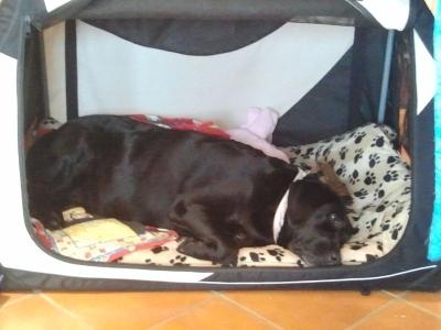 Das sind Sachen, die für sie unheimlich anstrengend sind (man sieht's an ihren Ohren, die sind ganz fest angelegt), aber ich merke hinterher immer, dass sie wieder ein Stück "gewachsen" ist. Ich hatte ihr extra eine Box gekauft in der Hoffnung, dass sie sich darin entspannen kann. Leider ist Marnie jetzt nicht so der Höhlenhund und fand das nicht so wirklich prickelnd, aber ein leckerer Knochen kann da schon mal Überzeugungsarbeit leisten: