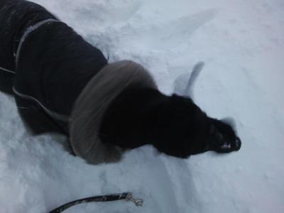 Tja, und dann kam der Winter. Über Nacht hatten wir 20 cm Schnee ... Marnie hat zum ersten mal ihren neuen Mantel ausgeführt (bissl unscharf, aber Marnie hatte Spass ...)