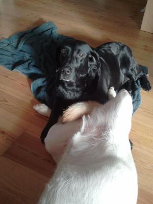 Es gibt natürlich auch immer mal die unvorhersehbare Situation und dann rappelt es, aber ich denke, dass ist normal. Mo's Herrmann (?) hat das abgekriegt, als er neugierigerweise seinen Kopf in Marnies Häuschen gesteckt hat. Marnie hatte einen Knochen und ich hab Herrmann nicht kommen sehen um ihn begrenzen zu können. Es war laut, aber es ist nichts weiter passiert, also kann ich damit leben.