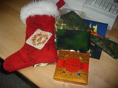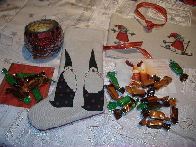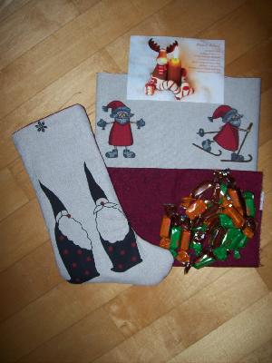 Jetzt habe ich gleich einen fertigen Stiefel davon und noch dazu Stoff zum Nähen , und einen glitzernden Teelichthalter, farblich passend zu meiner Weihnachtsdeko, und auch noch süße Nervennahrung  _________________ Heiter weiter,