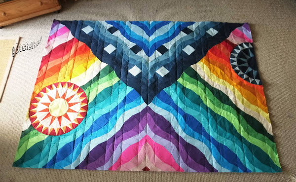 Ich kann euch von einem großen Fortschritt berichten - die ganzen Quadraten und die beiden Sonnen sind zusammen genäht.