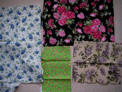Vom linken habe ich etwas mehr, das ist ca ein Longquarter mit kleinen blauen Röschen, der hellgrüne das sind kleine rosa-rote Röschen mit Blättchen dran. rechts Lavendel (oder Flieder?) auf cremefarbenem Grund, alles PW Stoffe. Der schwarzgrundige ist eher wie Batikstoff (vom Stoffmarkt), also etwas fester und dünner.