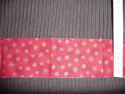 Der rote Hintergrund sieht so etwas nach Batik aus, er ist nicht einfarbig rot, sondern mal etwas heller mal dunkler, und die Schneeflocken sind golden.