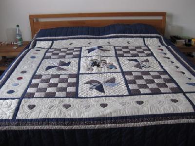 Heute habe ich nun mit Hilfe meines Sohnes endlich gelernt, wie man Bilder einstellt. Diese Decke war meine erste größere Arbeit und ein Geschenk für meine Tochter zu ihrem Geburtstag und Umzug in eine neue Wohnung. Der Entwurf stammt aus einem Buch, das ich mir aus der Bücherei auslieh, leider weiß ich den Titel nicht mehr.