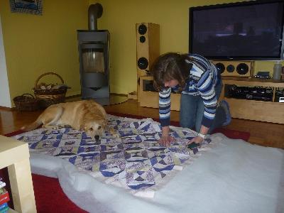 Die Rückseite vom Kissen: ist die Rückseite vom Quilt auch in diesem Batik-Stoff? Das sieht auf die gesamte Fläche dann auch noch von hinten schönstens aus (hab ich auch schon für einen Quilt verarbeitet) Ich staune über deinen Fleiß - machst du auch noch was anderes? Der Tag hat doch für uns nur 25,5 Stunden...