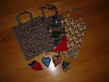 Die "Herzen" sind auch Taschen. Man kann den Einkaufsbeutel so zusammenfalten und dann in der farbigen Ecke (beim mittleren sieht man es gut, die rote Ecke unten rechts) verstecken und mit einer Kordel zuschnüren. Dabei kommt dann das Herz heraus  |