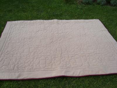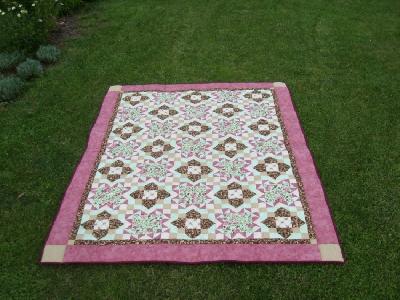 So jetzt kommt die Sache zum Abschluss sprich zur Übergabe, denn der 85. Geburtstag meiner Schwiegermutter naht. Habe noch schnell ein paar Erinnerungsfotos gemacht bevor das gute Stück das Haus verlässt. das Top war ja recht schnell genäht aber das Zusammenfügen und Quilten hat mich den ganzen Sommer beschäftigt.