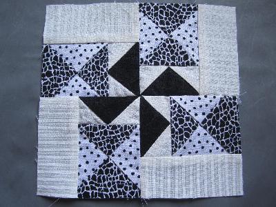 Genäht, alle schwarzen Spitzen abgesäbelt, getrennt, neue Flying Geese genäht, wieder alles zusammen und so bleibt er jetzt.