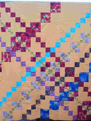 Das TOP ist 1,80 x 2,40 m. Die Idee für dieses Muster habe ich von dem "Quilt für eine Freundin"https://www.patchwork-quilt-forum.de/quilt-fuer-eine-freundin-t35048.html übernommen und das Muster dann erweitert. Der Ursprungsquilt ist in der Diagonale gequiltet. Jetzt ist meine Überlegung denn Schwerpunkt es Quiltmusters in die Orangen Felder zu legen und das o. die Muster zu verbinden. Hoffentlich versteht ihr was ich meine.
