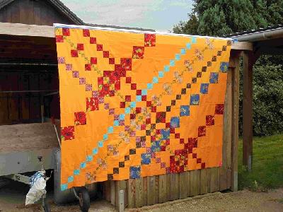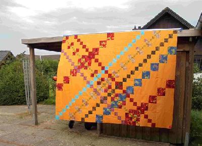 Eigentlich war er als Geburtstagsgeschenk für meinen Bruder gedacht, jetzt hat mein GöGa sein Veto eingelegt. Der Quilt sei ein viel zu kostbares Geschenk für jemanden aus dem "Staate Nimm". Wenn ich ehrlich zu mir bin, muss ich meinem Mann recht geben. (Was für ein Sch....spiel!!!)