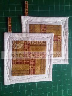 Ich hab fuer meine Oma zum Geburtstag diese Topflappen genaeht. Ich war erst nicht so sicher wegen dem weissen Rand, aber nach dem quilten war ich dann doch ganz happy. Ich hoffe, sie wird sich freuen.