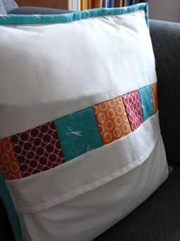 Danke für Eure netten Kommentare und Danke für den Song, klasse! Die Umrandung für ein Kissen nähe ich wie für einen Quilt das Binding. Und zwar nähe ich dabei alles auf einmal fest, Binding, Kissentop, das Vlies, die Toprückseite und die beiden Einsteckstoffe (von oben aufgezählt).