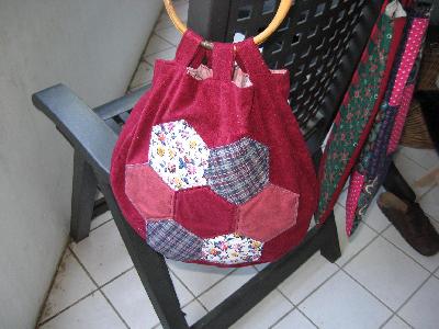 .... eine Bestellung von einer Hobbyisten-Freundin. Die Tasche sollte zu ihrem Outfit passen (Stoffreste davon), also etwas "Alt" wirken, Platz haben und die Holzringe als Griffe haben.