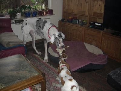 Als unser kleine Maus raus durfte, war ich erleichtert. Ich kannte sie ja nur aus Bilder, sie ist so hübsch und und lieb. Die Heimfahrt hat ihr gut gefallen in meinen Armen hat sie geschlafen. Daheim angekommen war die Frage was wird unser Großer(Dogge) dazu sagen? Aber er ist sehr lieb mir ihr umgegangen und hat sie zum spielen aufgefordert. Bin sehr glücklich über unsere Entscheidung, einen kleinen Hund zu retten und bei uns aufzunehmen.