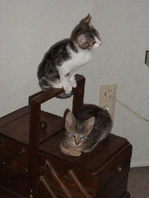 Und wie es sich für Nähkatzen gehört, turnen sie schon fleißig auf meinem Nähkasten herum: