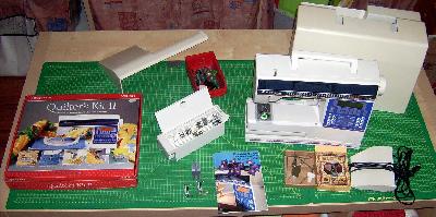 Zum einen ist da die Husqvarna Lilly 530 mit der ich immer zufrieden war,nur steigen ja auch die Anspüche.Mit dabei ist ein Quilterset ,wie auf dem Bild zu sehen ist und auch Zwei Obertransportfüsse.An dem kl weissen Anschiebetisch ,ist an der re Ecke etwas abgebrochen,somit hält er nicht richtig,aber im Set ist noch ein grösserer Anschiebetisch.