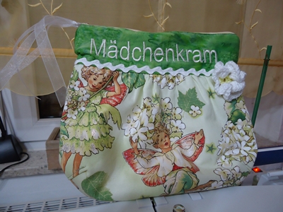sehr schöne Täschchen. Der Schriftzug Mädelskram hätte auch sehr gut auf mein Kosmetiktäschchen gepaßt aber leider können weder meine Maschine noch ich sticken.