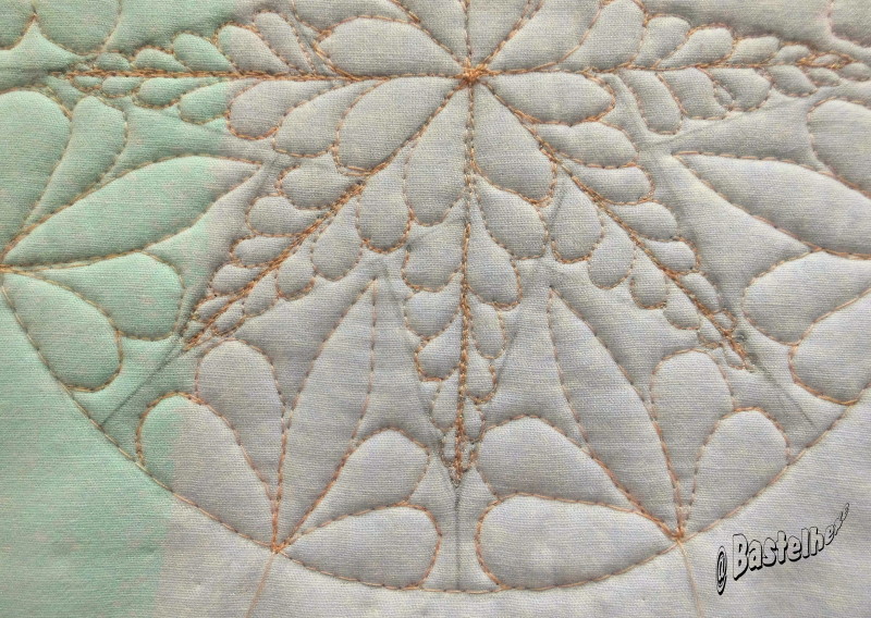 Um zu testen, ob ich es überhaupt schaffen kann habe ich auf einem ausrangierten Stück Bettbezug die Kontur des Mittelkreises vom Top 1:1 mit Bleistift aufgezeichnet, ein Sandwich geheftet und aus dem Lameng heraus und ohne Vorzeichnung losgequiltet. Am Anfang doch noch sehr unbeholfen, aber es hat immer mehr Spaß gemacht und ich bekam immer mehr Sicherheit.