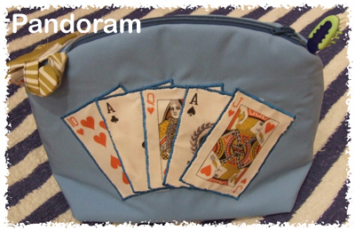 Ich habe Spielkarten eingescannt, und dann auf Bügelpapier ausgedruckt und auf weiße Baumwolle gebügelt. Anschließend habe die Karten auf die Vorderseite der Tasche appliziert. Wie man sieht liegen Herz10, KreuzAss, HerzDame, PiekAss und HerzBube auf dem Board. Da stellt sich die Frage, welche Karten mein Schatz auf der Hand hält.