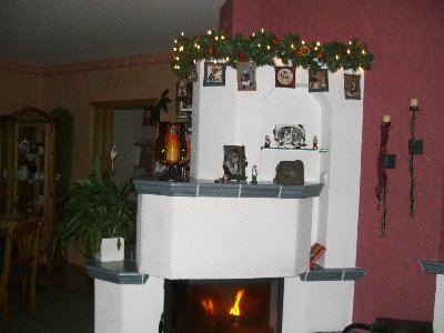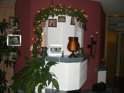 Hier mal ein Bild vom Kamin mit Lichtergirlande und Patchworkbilder!