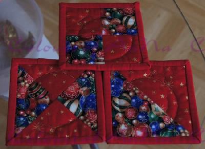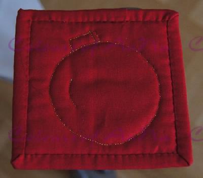 Diese Variante MugRugs habe ich 18 mal angefertigt. Von jedem "Block" gibt's jeweils 2 Stück, also Sets von 6 für jeweils Ellis und Schwiegerellis und unseren eigenen Haushalt. Die verschenkten Varianten waren handgequiltet, unsere eigenen per Maschine, da ich die spezielle Sticknadel ausprobieren wollte. Die handgequilteten fand ich schöner - deswegen habe ich sie ja auch verschenkt! Die Vorlage für die Christbaumkugel habe ich mir mit Pappe selbst gebastelt.